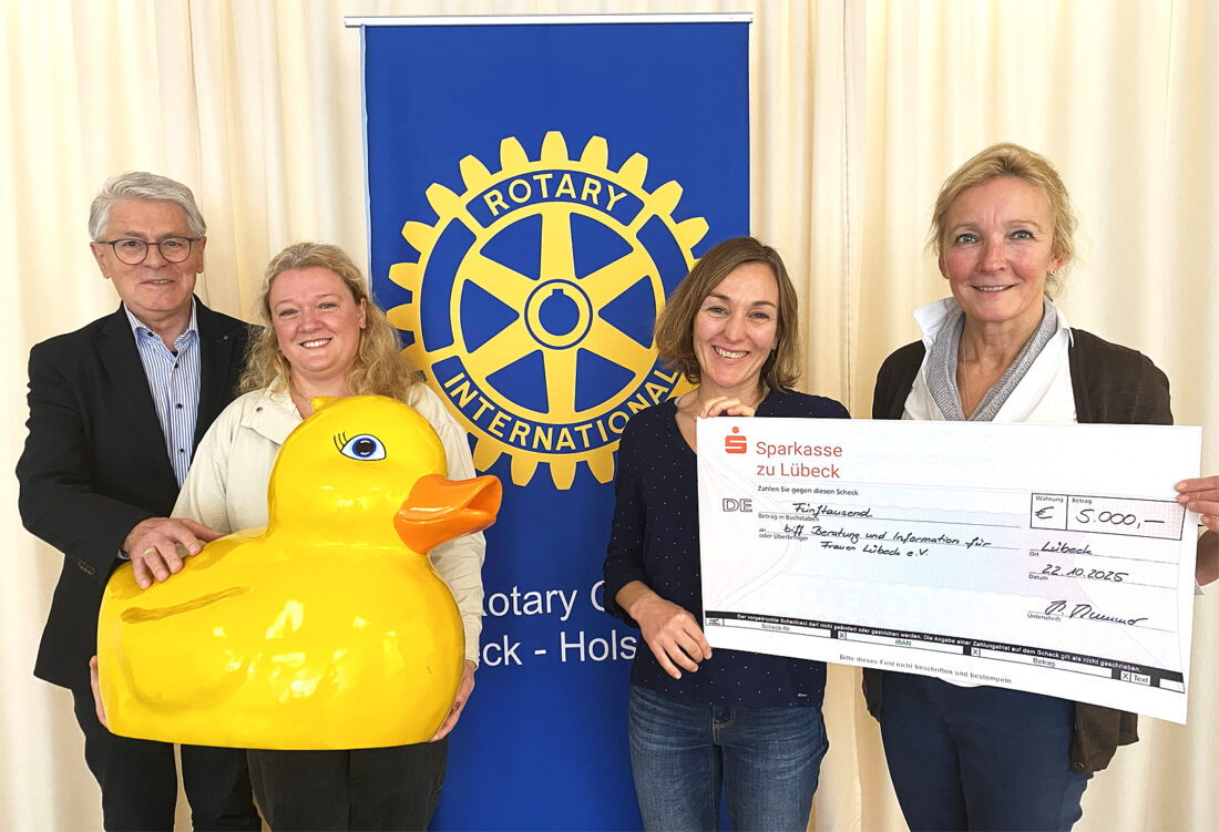 22. Oktober 2025 – Mit einer symbolischen Scheckübergabe in den Räumen des Vereins biff* – Beratung und Information für Frauen* Lübeck e.V. haben der Rotary Club Lübeck-Holstentor und der Verein Lübecker Entenrennen e.V. ihre Verbundenheit mit der wichtigen Arbeit der Beratungsstelle unterstrichen. Überreicht wurde die Spende in Höhe von 5.000 Euro an die Vereinsvorsitzende Verena Bohl und die Psychologin Orinda Legisi.